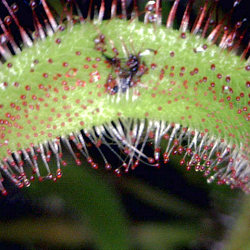 "It is only very small insects that are caught, of course. The way of it is this. These drops shining in the sun prove very attractive to any little flies and gnats that may come near. Some of them naturally alight on the leaves, right among the drops glistening on the ends of the little hairs; but then they find that the drops are sticky, and they cannot get away easily. Then, too, the long hairs around the edge of the leaf seem to suddenly become alive, and they slowly bend over and hold the victim securely; then the sides of the leaf roll up and partly enclose it, and there the poor fly is fast in a trap, and there it stays till it dies."