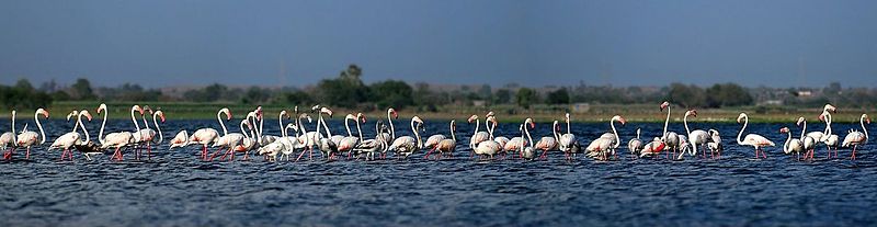 These birds always keep in companies, whether in the air or on the land; and while they are feeding or resting, one of them acts as sentinel, and on the approach of danger gives the alarm by making a trumpet-like noise, and starts off, leading all the rest of the flock. They can both fly and run swiftly, but though web-footed, they cannot swim. Their web feet, however, assist them in wading, by keeping them from sinking in the soft, muddy bottom. When flying over the land, they keep high up in the air, but fly very low over water. They never alight on land, but keep sailing round and round over a shallow place until they finally alight in the water, and then wade to shore. The small head, huge crooked bill, long and slender neck, stilt like legs, and comparatively small body give the flamingo the most peculiar form among birds.