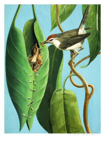 He uses his beak to pierce a row of holes along each. Then he finds his thread of grass. He pushes this through the holes with his beak and draws the leaves together. This makes a pretty leaf covering. In this hollow he fits his cozy nest, lined with soft white down. The green leaves hide the nest from the sharp eyes of his foes. Here the little Tailor Bird will be safe.